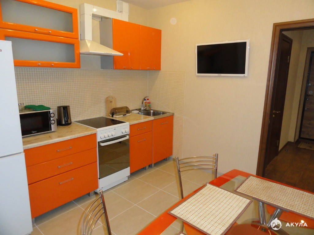 Полностью оборудованная кухня: холодильник, плита с 4 конфорками, духовка, микроволновка, электрический чайник, небольшой набор посуды.