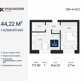 Однокомнатная квартира от застройщика с предчистовой отделкой в ЖК "Преображенский" на 5 этаже. Общая площадь: 44.22 кв.м., жилая: 16.83 кв.м., площадь просторной кухни-столовой: 17.5 кв.м. Все окна выходят на одну сторону. В квартире один совмещенный санузел. Высота потолков 2.7 м....