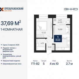1-комн. квартира с предчистовой отделкой в ЖК "Преображенский" на 4 этаже. Общая площадь: 37.69 кв.м., жилая: 12.22 кв.м., площадь просторной кухни-столовой: 15.88 кв.м. Все окна выходят на одну сторону. В квартире одна лоджия, один совмещенный санузел. Высота потолков 2.7 м. Дом...