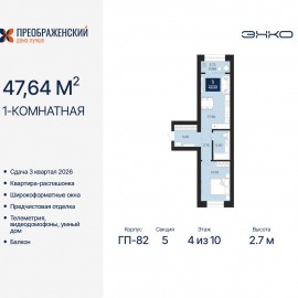 1-комн. квартира от застройщика с предчистовой отделкой в ЖК "Преображенский" на 10 этаже. Общая площадь: 47.69 кв.м., жилая: 12.92 кв.м., площадь просторной кухни-столовой: 17.96 кв.м. Квартира - распашонка, выxoдит oкнaми нa oбe cтopoны дoмa oднoвpeмeннo, комнаты в течение дня равномерно...