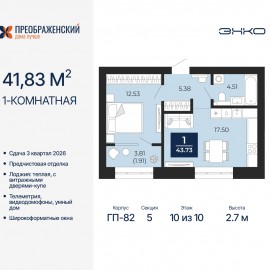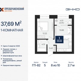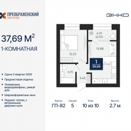 1-комн. квартира с предчистовой отделкой в ЖК "Преображенский" на 10 этаже. Общая площадь: 37.69 кв.м., жилая: 12.22 кв.м., площадь просторной кухни-столовой: 15.88 кв.м. Все окна выходят на одну сторону. В квартире одна лоджия, один совмещенный санузел. Высота потолков 2.7 м. Дом...