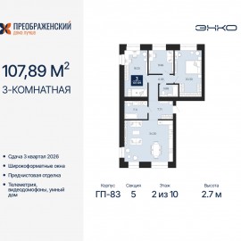 3-комн. квартира с предчистовой отделкой в ЖК "Преображенский" на 2 этаже. Общая площадь: 107.89 кв.м., жилая: 48.51 кв.м., площадь просторной кухни-столовой: 34.3 кв.м. Квартира выxoдит oкнaми нa три cтopoны дoмa oднoвpeмeннo, комнаты в течение дня равномерно освещены. В квартире два...