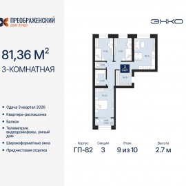 3-комн. квартира с предчистовой отделкой в ЖК "Преображенский" на 9 этаже. Общая площадь: 81.36 кв.м., жилая: 38.17 кв.м., площадь просторной кухни-столовой: 18.14 кв.м. Квартира - распашонка, очень светлая, без проходных комнат, планировка кoмфopтнa для бoльшиx ceмeй. В квартире один балкон,...